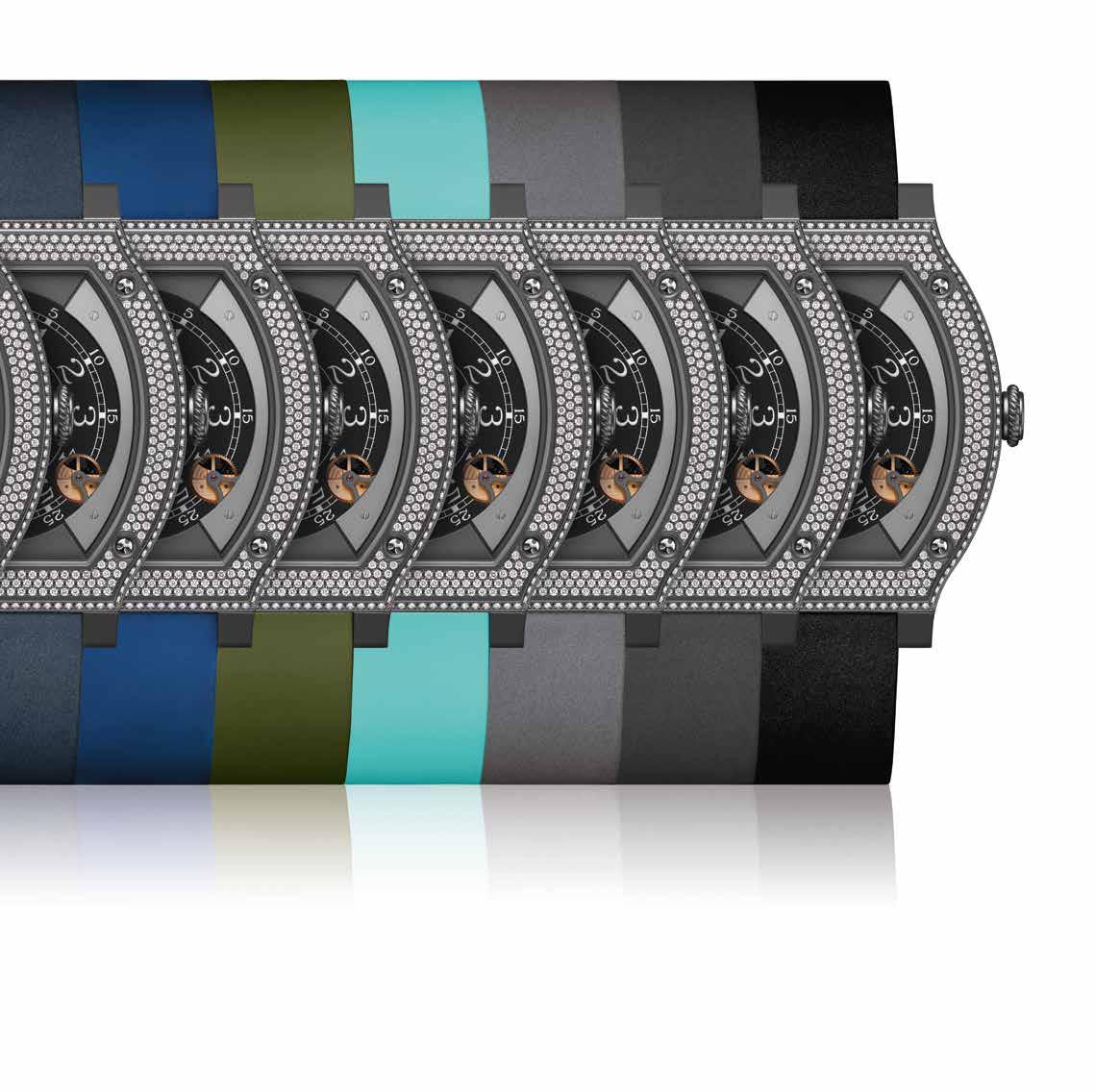 Case: Flat Tortue ® shape in Titanium with Titalyt ® treatment, Titalyt ® or Titalyt ® set screwed bezel with 418 brilliant-cut diamonds VS1 F/G ~ 1.06 carat, screwed crown, 3 atm water resistant. Dial: luminescent black centre. Hands: rhodium-plated Steel. Movement: electromechanical. Autonomy: 8 to 10 years in daily use, 18 years in standby mode. Strap: rubber available in 13 colors.