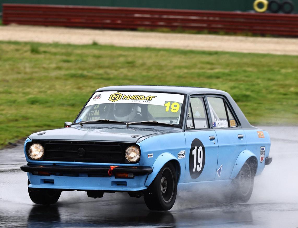 This was an MSCA round and unlike the previous weekend, two words come to mind: Wet and cold. Great weather for geese and ducks; funky trackside conditions for drivers with recoveries and red flags ahoy due to the soggy-boggy infield. We even had over a dozen interstate drivers from the Porsche club who were there the day before – why wouldn’t you make a weekend of it!. Unfortunately, the track claimed an MG at the exit of Turn 12, a notorious corner at the best of times. Regardless of car or club, we never like seeing that. The dozen or so people who helped push his car on to the trailer is a testament to the camaraderie of grassroots motorsport. Our thoughts and best wishes are with Ron for a speedy recovery. Speaking of recovery, it’s been mentioned before- these days cannot run without officials, and if you have ever wanted to get the closest humanely possible to the track, then why not consider helping out? Flaggies are always needed, and you do really get the best view. You are compensated for your time and reward with plenty of waves and thankyou’s from we competitors. Get in contact if you are keen- it doesn’t have to be every round- a day or two a year will help.