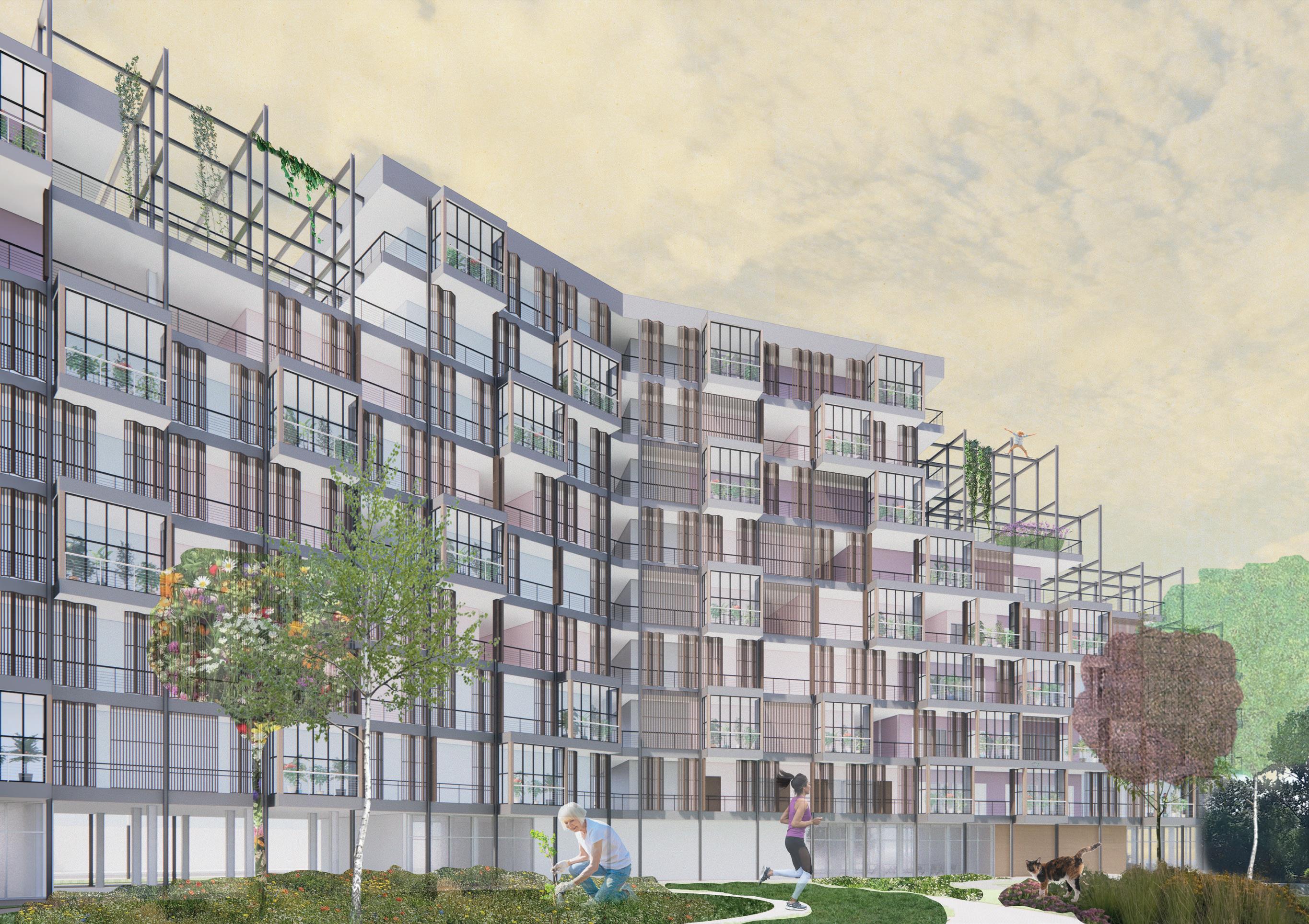 01. Lightweight cultivation soil 02. Impermeabilization plaster 03. Drainage layer 04. Slope screed 05. Impermeabilization plaster 06. Rockwool insulation 07. Vapor barrier 08. Reinforced concrete 09. Shaped steel 10. Plasterboard