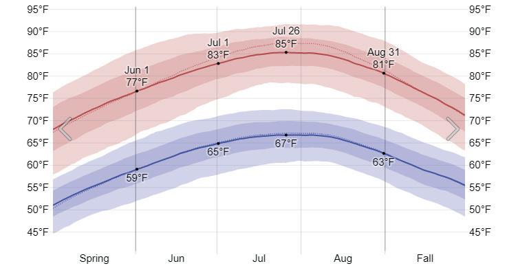 Daily high temperatures increase by 4°F, from 77°F to 81°F, rarely falling below 67°F or exceeding 92°F. The highest daily average high temperature is 85°F on July 26. Daily low temperatures are around 63°F, rarely falling below 52°F or exceeding 73°F. The highest daily average low temperature is 67°F on July 29. For reference, on July 26, the hottest day of the year, temperatures in Milan typically range from 67°F to 85°F, while on January 12, the coldest day of the year, they range from 31°F to 42°F.