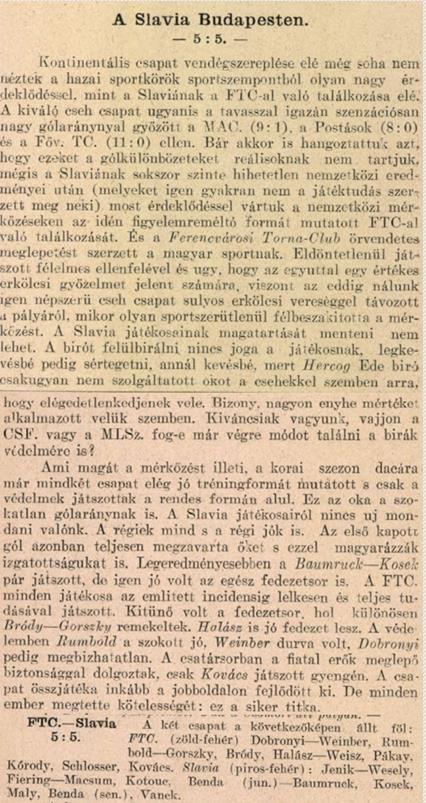 Volt serlegmérkőzés is, a derék újpestiek bánták az FTC javuló formáját. Megjegyezzük, hogy amire Schlosser Imre utalt az életrajzi könyvében, hogy visszaküldték a II. csapathoz erősödni, az ettől a héttől következett be.