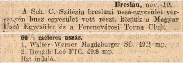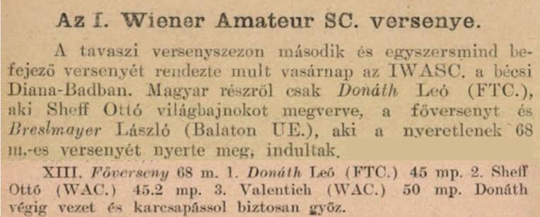 Donáth Leó Boroszlóból Bécsbe érkezett, ahol ugyancsak szerzett egy második helyezést a WAC úszóversenyén.