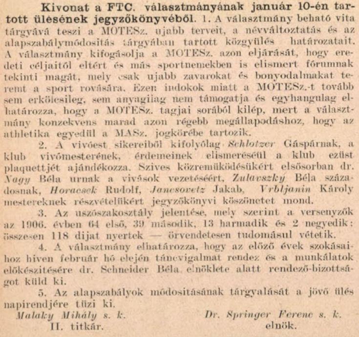 Az év első választmányi ülésén igazán nagy horderejű döntés született, az FTC kilépett a MOTESZ-ből. Az 1906-os évben már említettük, hogy viszály tört ki a MASZ és a MOTESZ között. Egy mondatba összesűrítve ennek oka az volt, hogy a MOTESZ, mint a legrégebben működő magyar sportszövetség a tornán kívül minden sport irányítására bejelentkezett. Tette ezt úgy, hogy apparátusa nem volt, a különböző sportágak alapszabályait sem ismerte vagy ismerte el. Egy példa, az atlétika elnevezés náluk nem létezett, ők az atlétikát népies játékoknak nevezték. Ezzel szemben a MASZ részletesen leírta az általa irányított sportágak (az atlétikán kívül az úszás, a vízipóló, a vívás, a tenisz, a birkózás)