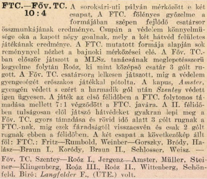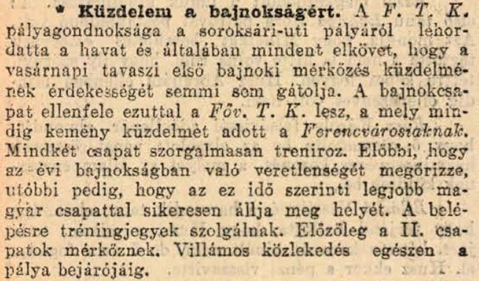 Mi sem természetesebb, ennek a felhívásnak az FTC pályagondnoksága igyekezett megfelelni, hogy a Főv. TC ellen a Soroksári úton lejátszandó mérkőzésnek részükről ne legyen semmi akadálya. 9