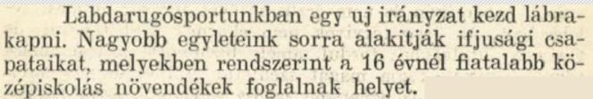 A nap utolsó híre, amely a labdarúgósport jövőjére nézve nagyon érdekes és nagy horderejű volt, a Nemzeti Sportban jelent meg nevezetesen, hogy nagyobb egyleteink, így nyilván az FTC is 16 éven aluli játékosokból