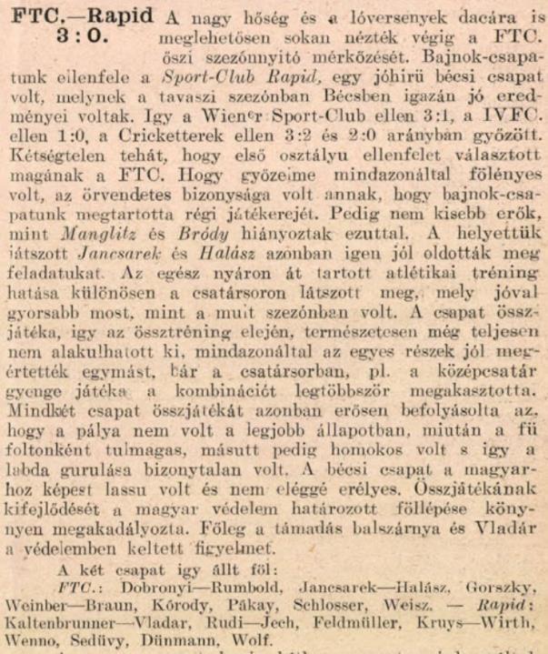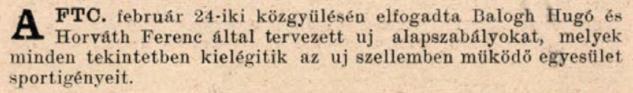 Nem maradt el viszont az FTC közgyűlése, amelynek legfontosabb napirendi pontja a klub új alapszabályának elfogadása volt, amelyet Balogh Hugó és Horváth Ferenc készített. Az új alapszabály az alapítás óta eltelt közel nyolc év tapasztalatai alapján készült, lényegében aktualizálta a régit, ahogy a pár soros tudósítás fogalmaz, megfelelt az új szellemben működő egyesületnek.