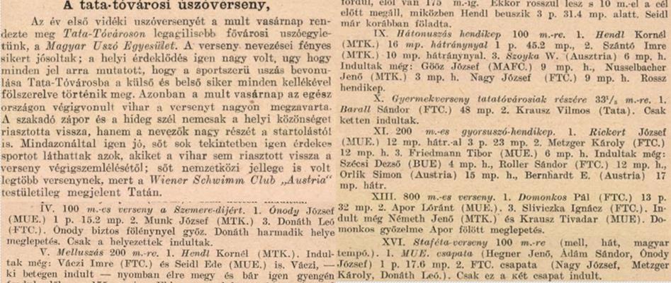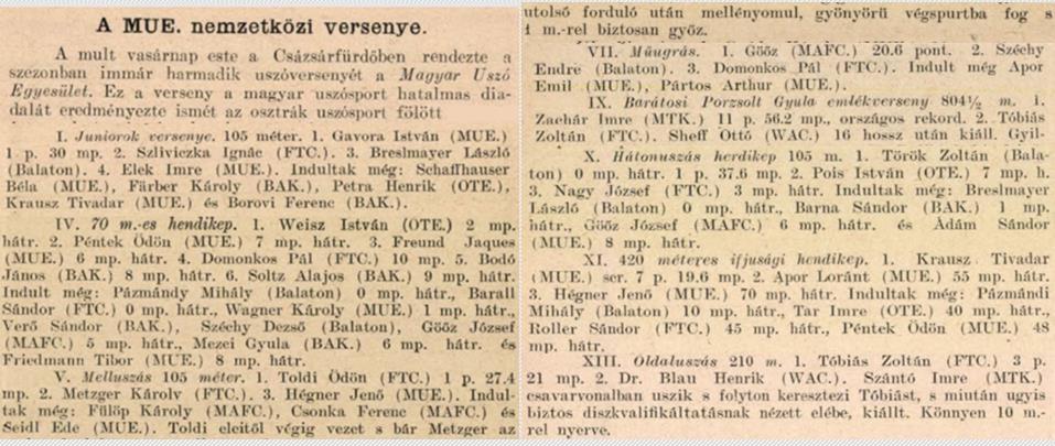 Úszóverseny is volt e napon, ahol Domonkos Pál és Nagy József indult az FTC részéről.