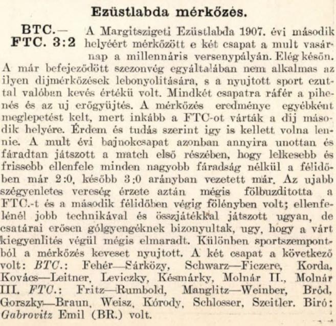 Újra két nap, két mérkőzés, nem lehet mondani, hogy kondícióban rosszul álltak volna eleink. Sőt, ez a második mérkőzés, ha nem is tétért zajlott, annál nagyobb presztízsért. Az ellenfél ugyanis a BTC volt, amely ki akarta küszöbölni a hírnevén 1906. decemberében esett csorbát. Nem tudta kiküszöbölni, megint kikapott.