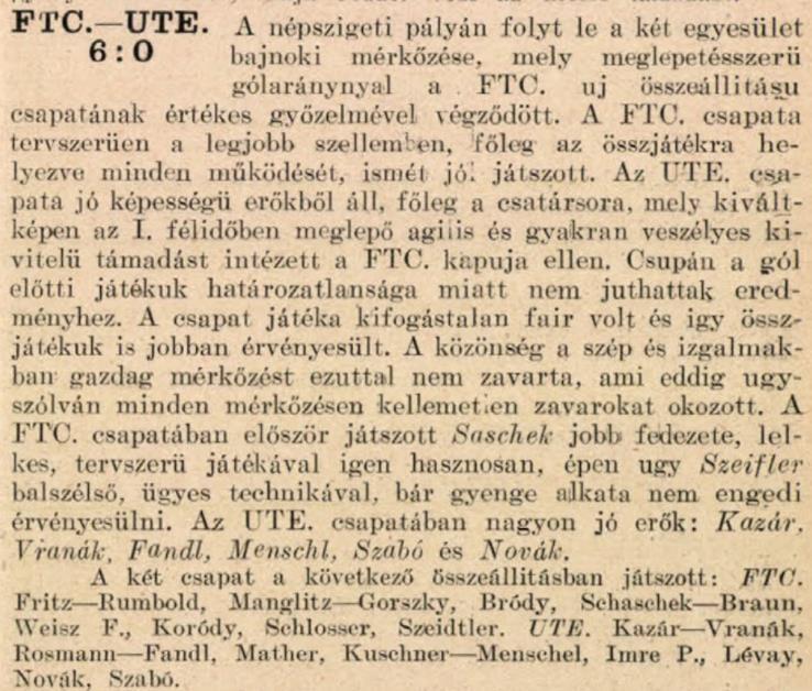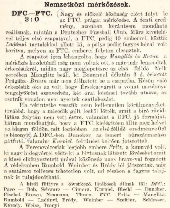Bár a bajnoki mérkőzések befejeződtek, az őszi szezon még nem ért véget, voltak meghívások, kötelezettségek. A meghívások egyike Prágából érkezett, ahová revans-mérkőzésre várták az FTC-t. Sikerült is a revans a Deutscher Fussball Clubnak, biztosan győzték le a tartalékos és az első 25 percben emberhátrányban játszó ferencvárosiakat. Miért volt emberhátrány? Banális ok miatt, a nem a csapattal utazó Manglitz nem érkezett meg pontosan a kezdésre, mert a vonat, amelyikkel utazott tengelytörést szenvedett, a tervezett csatlakozást lekéste. Ilyen is volt akkoriban!