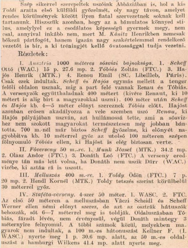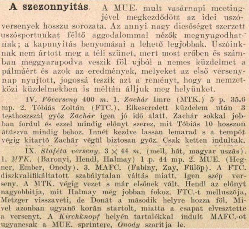 A nap híre volt, hogy megalakult a Magyar Úszó Szövetség, a MUSZ, amely így immáron önállóan képviselhette a diadalmasan fejlődő magyar úszósport ügyét. Mi sem természetesebb, hogy az új szövetség létrejötténél ott „bábáskodtak” az FTC vezetői is, akik közül külön is kiemelték dr. Springer Ferencet és Kánitz Henriket. Az elsőként megválasztott tisztikarban is találunk ferencvárosi neveket, Mednyánszky-Kánitz Henrik alelnök, Malaky Mihály ellenőr dr. Schneider