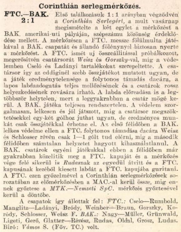 Újabb vándordíjért szállt harcba az FTC, lejátszotta le első mérkőzését a Corinthian-vándordíjért a BAK ellen. A díj története igencsak érdekes, 1904-re nyúlik vissza. Ebben az évben vendégszerepelt Budapesten a kor egyik neves (szokták mondani, legkiválóbb amatőr) angol csapata, a Corinthian FC. Három magyar csapattal, sorrendben az MTK-val, a BTCvel, végül a MAC együttesével mérkőztek. A vendéglátás olyannyira megfogta az együttes vezetőit, hogy egy esztendő múltán, 1905-ben ennek emlékére egy ezüstserleget küldtek a MAC részére. Hozzá pedig egy kérést, hogy a MAC minden évben szervezzen egy örökös vándordíjat, amelynek neve „Corinthian Football Club Vándordíj”. Kikötötték azt is, hogy ezért a díjért kizárólag csak amatőr magyar