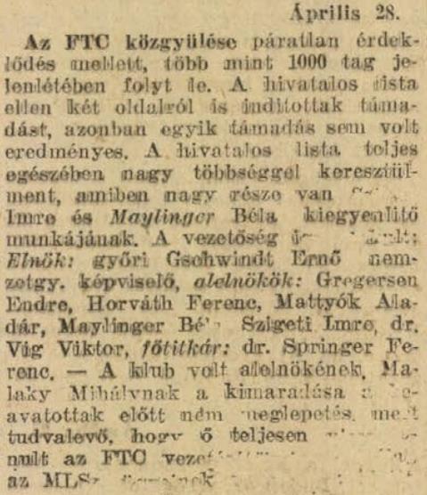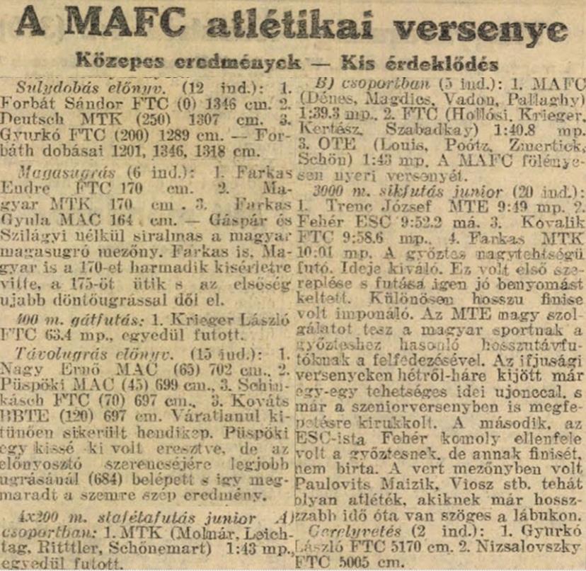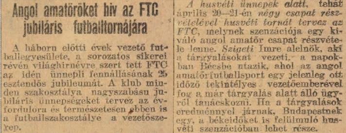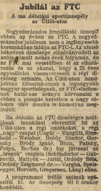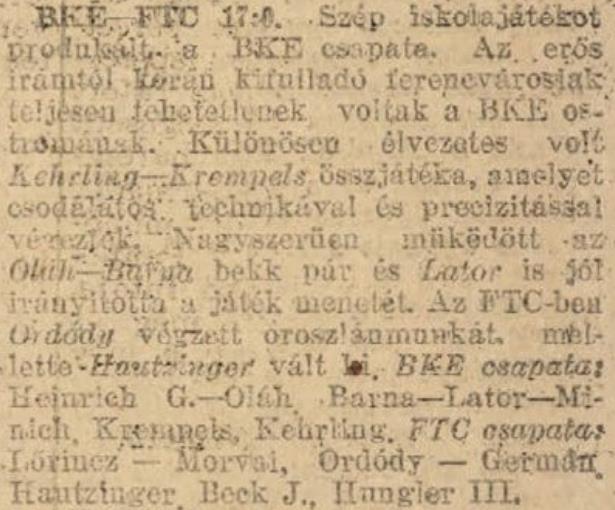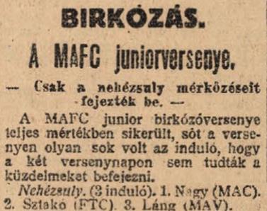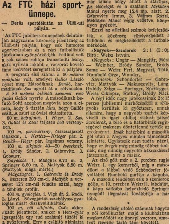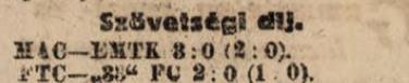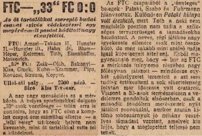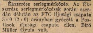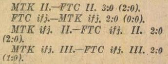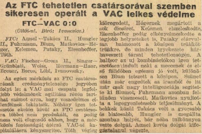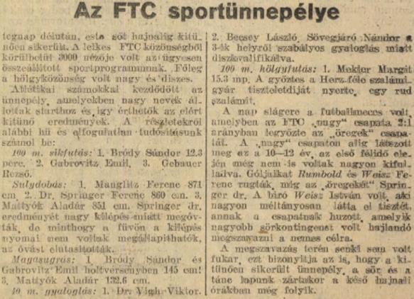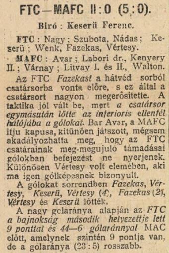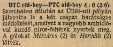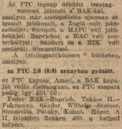 A labdarúgók első tréningmérkőzése nem volt az igazi. Nem, mert épp a legfontosabbak, a labdarúgók hiányoztak, a kezdésre az FTC csak kilenc játékost tudott felvonultatni, ráadásul ebben benne volt az atlétából lett vészkapus, Englohner Ferenc és az oldboy-csapat játékosa, Kellner Vilmos is. Így már nem is tűnt meglepetésnek a MAC 4:3 arányú sikere.