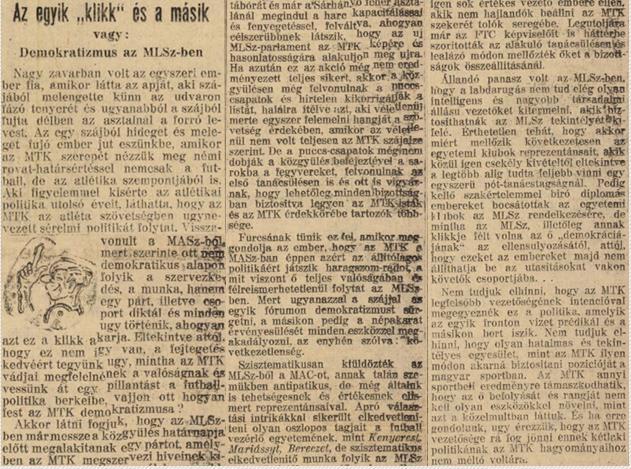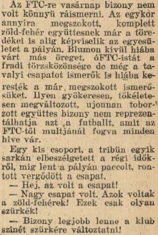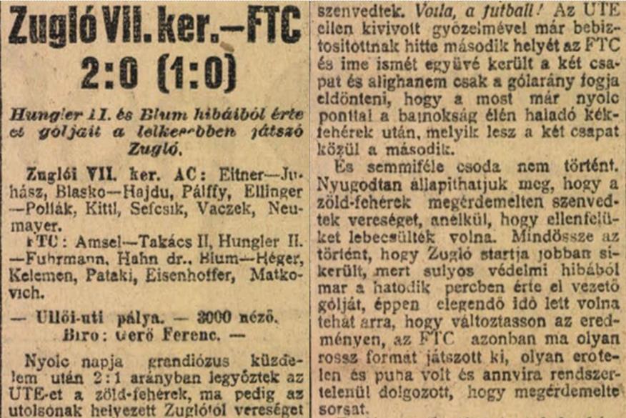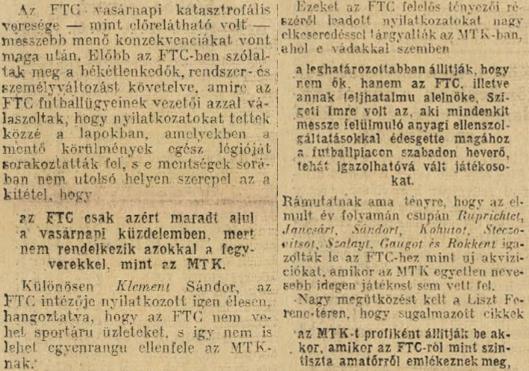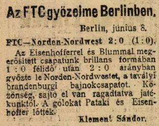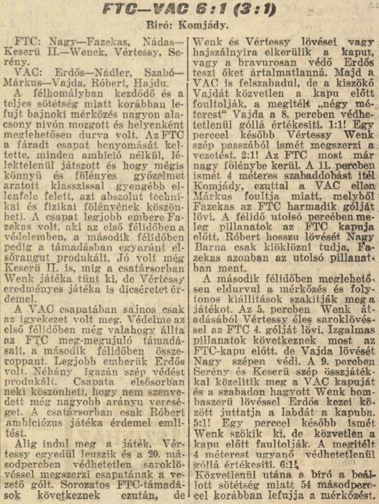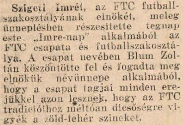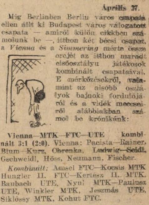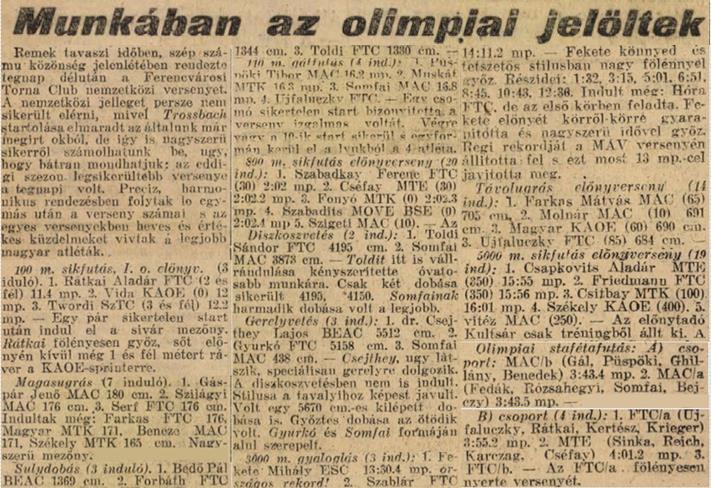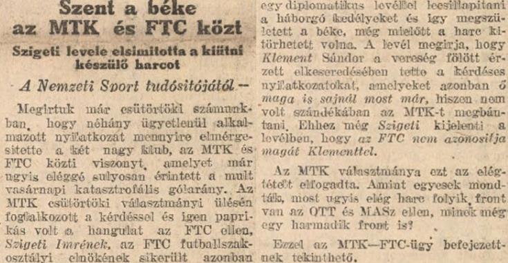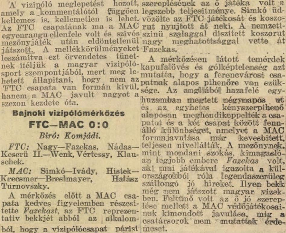 A labdarúgók első tréningmérkőzése nem volt az igazi. Nem, mert épp a legfontosabbak, a labdarúgók hiányoztak, a kezdésre az FTC csak kilenc játékost tudott felvonultatni, ráadásul ebben benne volt az atlétából lett vészkapus, Englohner Ferenc és az oldboy-csapat játékosa, Kellner Vilmos is. Így már nem is tűnt meglepetésnek a MAC 4:3 arányú sikere.