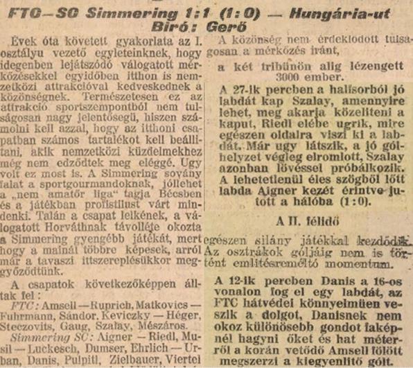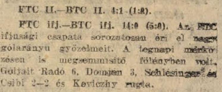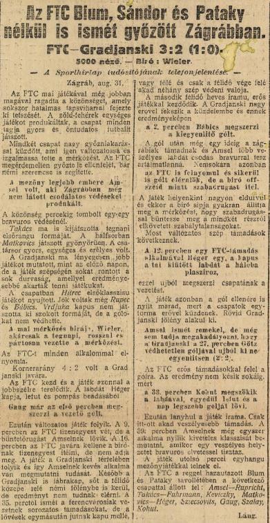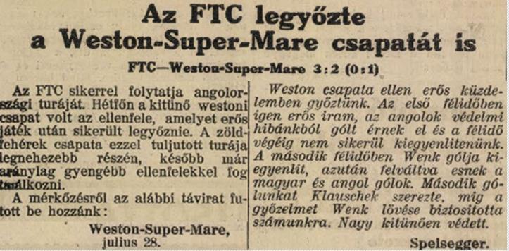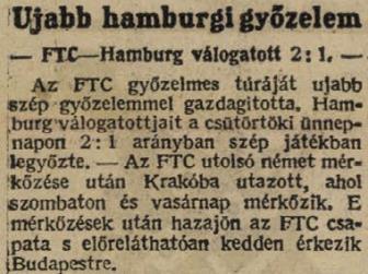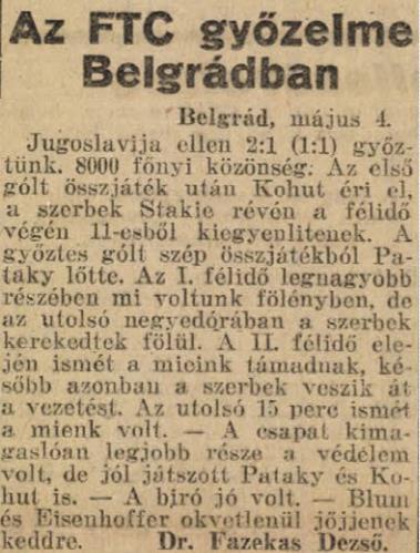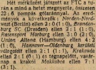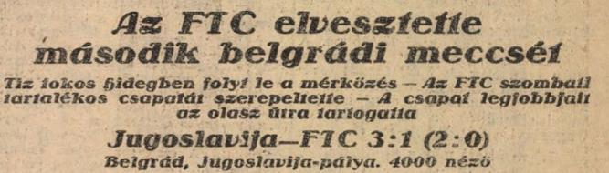 Az FTC labdarúgói megkezdték téli túrájukat, amelynek végcélja Olaszország volt, ám útközben már Belgrádban is mérkőztek, ahol első ellenfelük a Beogradski csapata volt, amelyet meglehetős magabiztossággal győztek le.