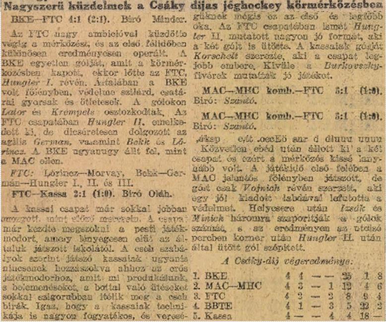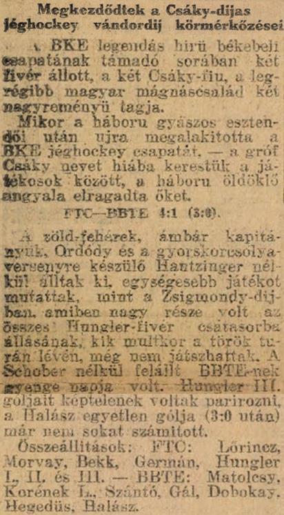 Alig ért véget a jégen a Zsigmondy vándordíj, máris elkezdődött az újabb torna, a nemzetközi Csáky vándordíj. A cikkből megtudhatjuk, kik is voltak a névadók, továbbá olvashatunk az FTC az első mérkőzéséről, amelyet a három Hungler fivér játékának köszönhetően biztosan megnyertek. A Hungler család tagjai nemcsak a futballpályán bizonyítottak, korcsolyával a lábukon sem csúsztak el.
