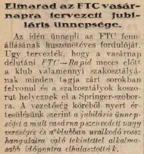 Hiába várták, nem érkezett haza az FTC. Nem kell semmi rosszra gondolni, nem emigrált a csapat, csupán annyi történt, hogy az FTC vonata elakadt a hóban. Olvashatjuk a magyar sajtó működésének anomáliáját is, hogy voltak lapok, amelyek nem tudósítottak az eseményekről, hanem költői módon kitaláltak eseményeket. Esetünkben ez arra vonatkozott, hogy egyesek szerint ünnepélyesen fogadták is a csupán öt órát késő csapatot.