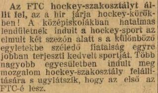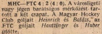 Jéghokiban (bandy) viszont súlyos vereséget szenvedett az FTC a kor legjobb magyar csapatától, a Budapesti Korcsolyázó Egylettől.