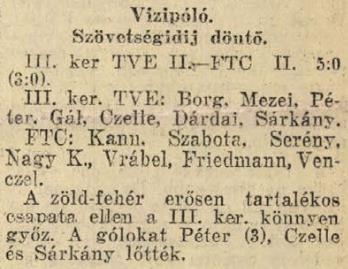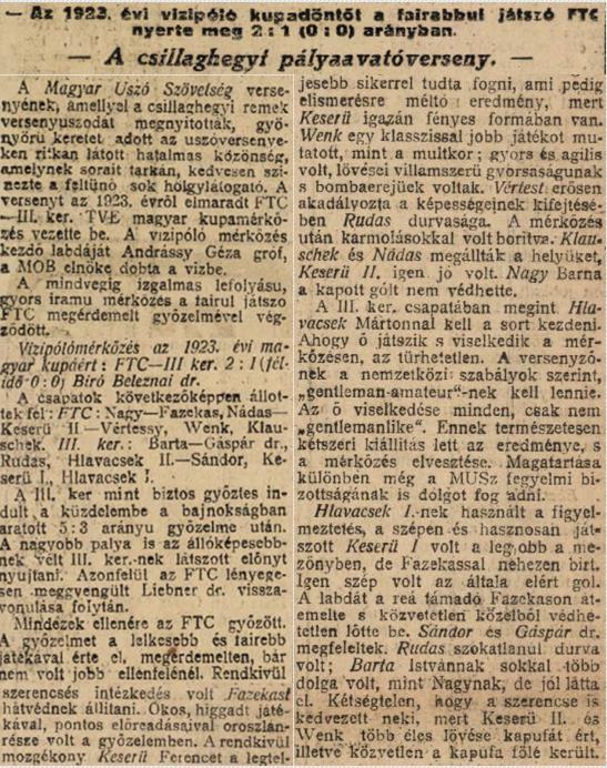 A Magyar Úszó Szövetség tanácsa véglegesen döntött az 1923. évi Magyar Kupa döntőjének ügyében, ami akkor elmaradt. Emlékeztetőül, a bíró és az FTC csapata késett az eredetileg kijelölt időponthoz képest, majd mire a bíró megérkezett, csak az FTC ugrott a vízbe, a III. ker. TVE nem kívánt játszani. Első fokon az FTC-t kupagyőztesnek hirdették, ami ellen a III. kerület fellebbezett. Lám, sikerrel járt, hiszen a 16 tanácstag közül 9 (?) nem kívánt a szavazati jogával élni, a szavazó 7-ből pedig 4-en a döntő 1924-es lejátszása mellett döntöttek.