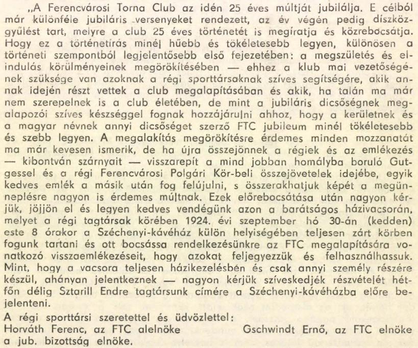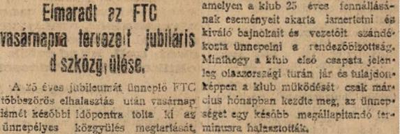 Az utolsó 1924-es időpont is meghiúsult a klub jubiláris díszközgyűlésének a megtartására. Ennek oka ezúttal a labdarúgók olasz túrája volt. Ha őszinték vagyunk, akkor elmondhatjuk, hogy ez az ünnepség tologatás bizony nem volt méltó a klubhoz, többet érdemelt volna, talán prioritást is kellett volna kapnia a negyedszázados jubileum méltó megünneplésének.