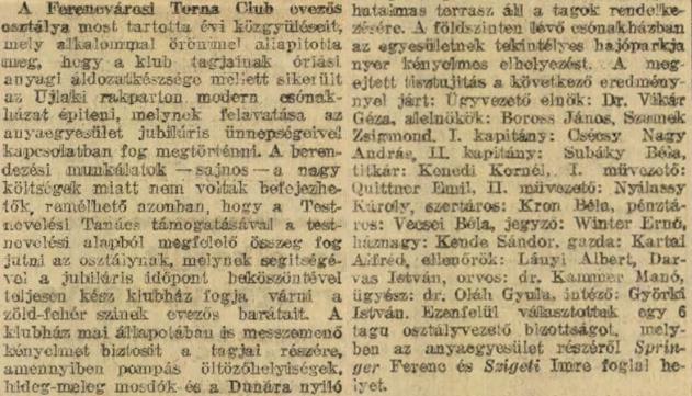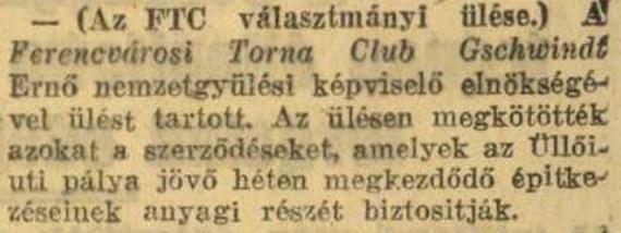 A Ferencvárosi Torna Club választmánya dr. Gschwindt Ernő elnök vezetésével ülést tartott, amelyen megkötötték a pályabővítést lehetővé tevő szerződéseket.