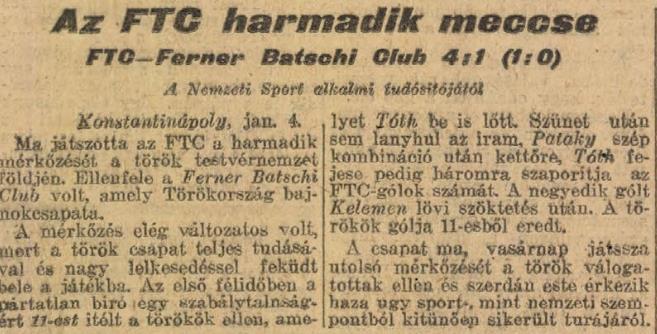 Az előző év végén láttuk, az FTC labdarúgói Konstantinápolyban időztek, ott búcsúztatták az ó- és köszöntötték az új esztendőt. Ez a köszöntés elég gólgazdagra sikeredett, hiszen az Altun Ordu együttesét 8:0-ra győzték le.