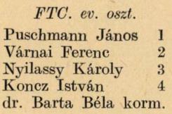 A 2-4. helyeken hármas holtverseny alakult ki, amelyből a negatív gólaránya miatt az FTC jött ki a legrosszabbul, így a negyedik helyet szerezte meg a tornán, csakúgy, mint két évvel korábban. Megjegyzendő, hogy a csapat legjobbjának tartott Ordódy Béla, ekkor már betöltötte a 44. életévét.