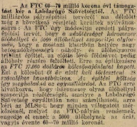 Az FTC folyamatosan a napirenden tartotta az Üllői úti pálya bővítésének a tervét. Ám ehhez, nem kis részben a pénzromlás miatt egyre nagyobb összegeket kellett előteremteni. A pálya üzemeltetői új forrás után néztek, úgy gondolták, majd az MLSZ is beszáll, ezért beadvánnyal fordultak feléjük.