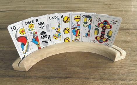 table. Et c’est ainsi qu’est né le porte-cartes à jouer, désormais fabriqué en série. Niklaus Manser l’utilise toujours pour jouer au jass et à d’autres jeux de cartes. Le porte-cartes existe en différentes couleurs.