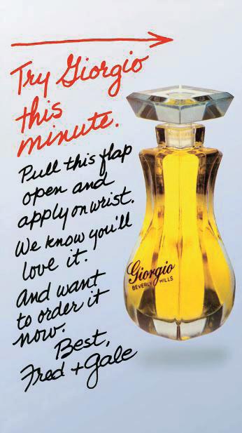 Giorgio appeared in the Giorgio boutique in October 1981. “The fragrance sold very nicely,” said Horner. “We wanted to roll it out into department stores, but Fred was adamant that no department store was ever going to carry another retailer’s fragrance. We tried to convince him otherwise, but he wouldn’t hear of it. So, we came up with the idea to try mail orders.”