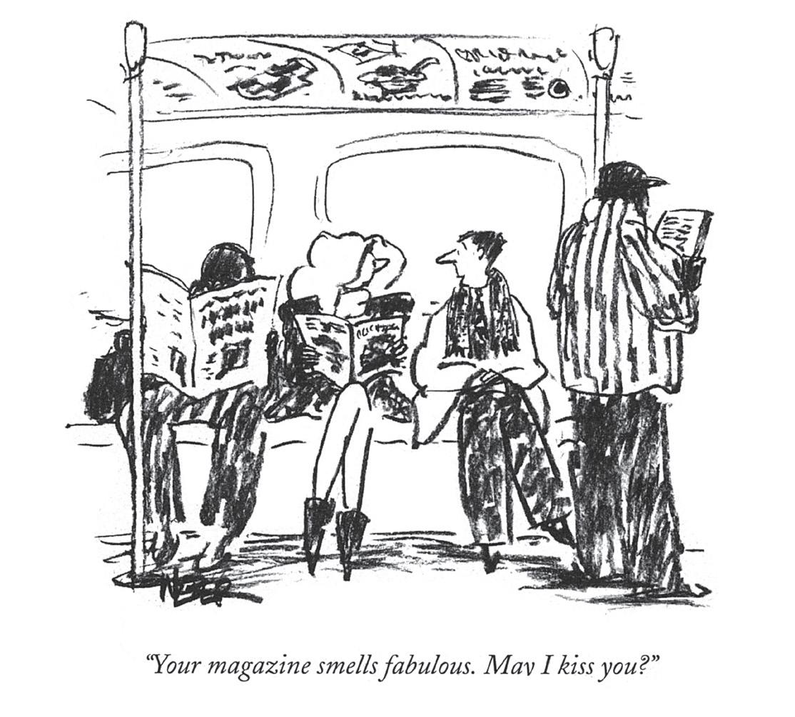 “Like so many of mankind’s truly pioneering inventions, the ability to make magazine pages redolent was an accidental byproduct of a search for something else,” explains Andrew Malcolm, in an article for The New York Times Magazine. “Back in the 1940’s Barrett Green, a research chemist for the NCR Corporation, was trying to find a way to prevent purple fingers, the
