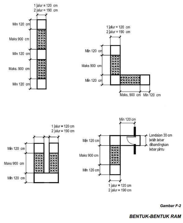 Panjang mendatar dari satu ram dengan perbandingan antara tinggi dan kelandaian 1:8 tidak boleh lebih dari 900 cm.