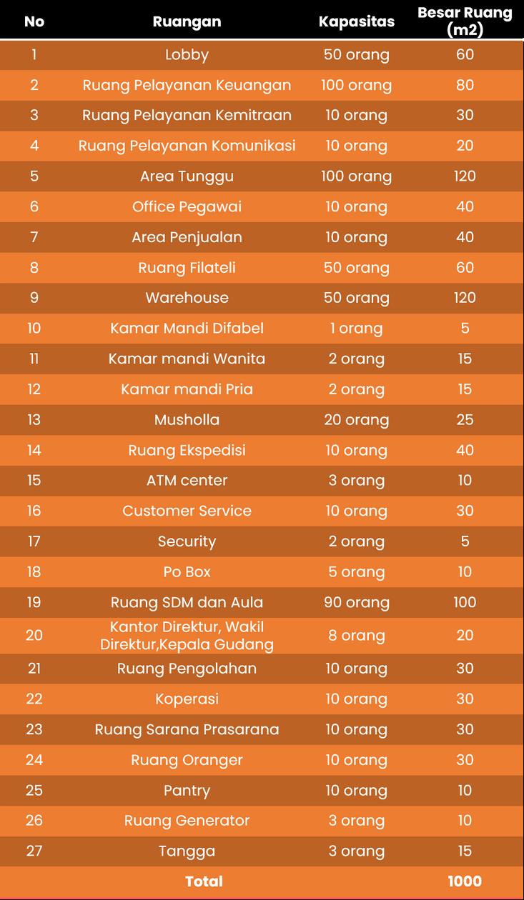e. Area Tunggu f. Office Pegawai g. Area Penjualan h. Ruang Filateli i. Warehouse a. Lobby b. Ruang Pelayanan KeuanganKamar mandi untuk pengunjung disediakan sesuai jenis