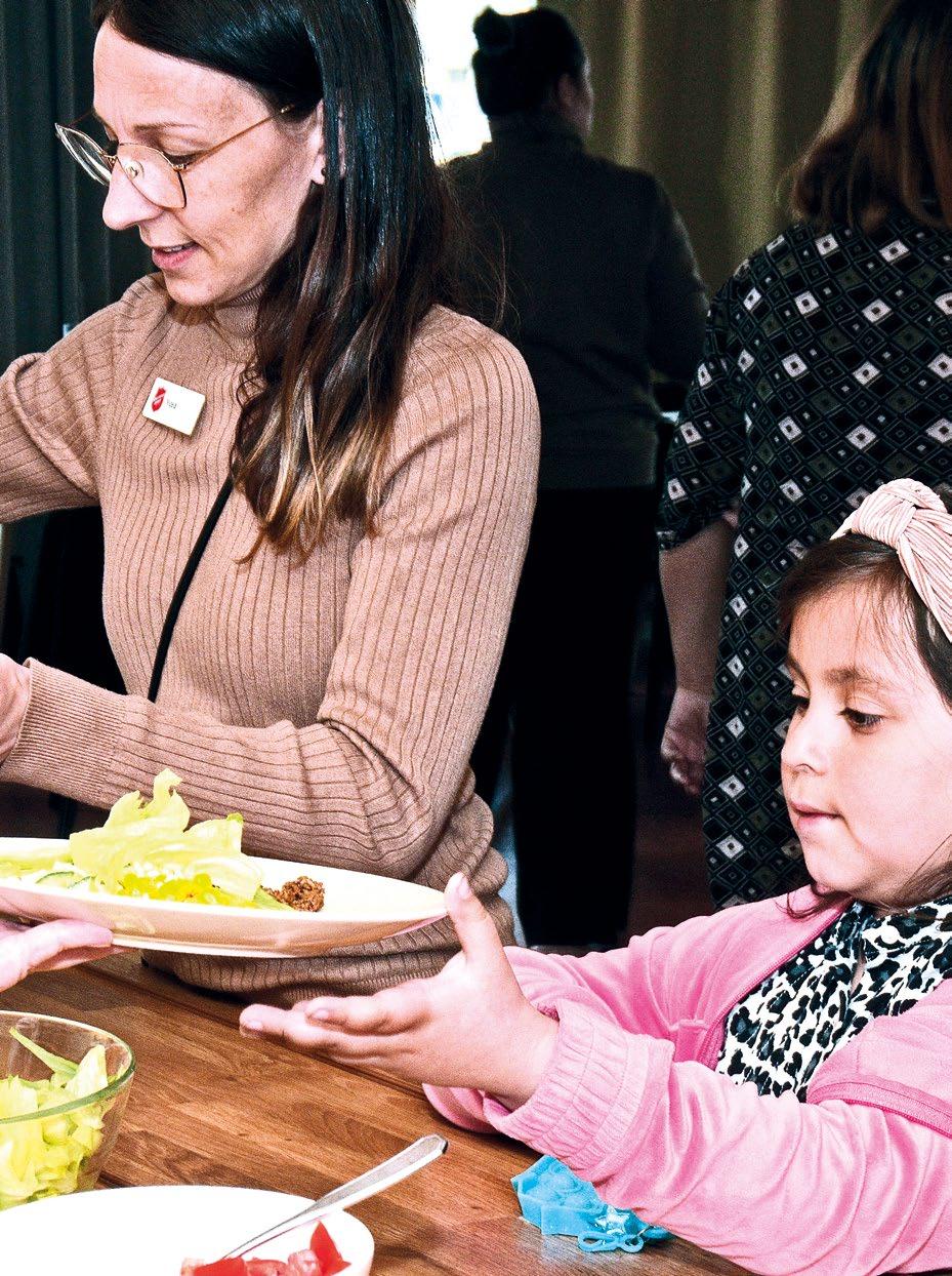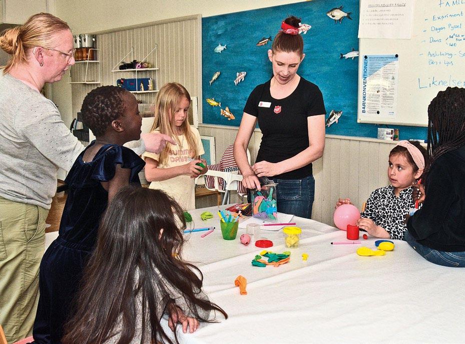 Under kårens Family-kvällar samlas gammal och ung till middag, andakt och aktiviteter. Här socialkonsulenten Micéla samt praktikanten Marias dotter.