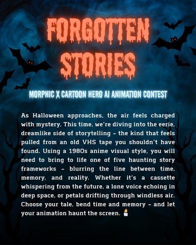 As Halloween approaches, the air feels charged with mystery. This time, we’re diving into the eerie, dreamlike side of storytelling - the kind that feels pulled from an old VHS tape you shouldn’t have found. Using a 1980s anime visual style, you will need to bring to life one of five haunting story frameworks - blurring the line between time, memory, and reality. Whether it’s a cassette whispering from the future, a lone voice echoing in deep space, or petals drifting through windless air. Choose your tale, bend time and memory - and let your animation haunt the screen. ��