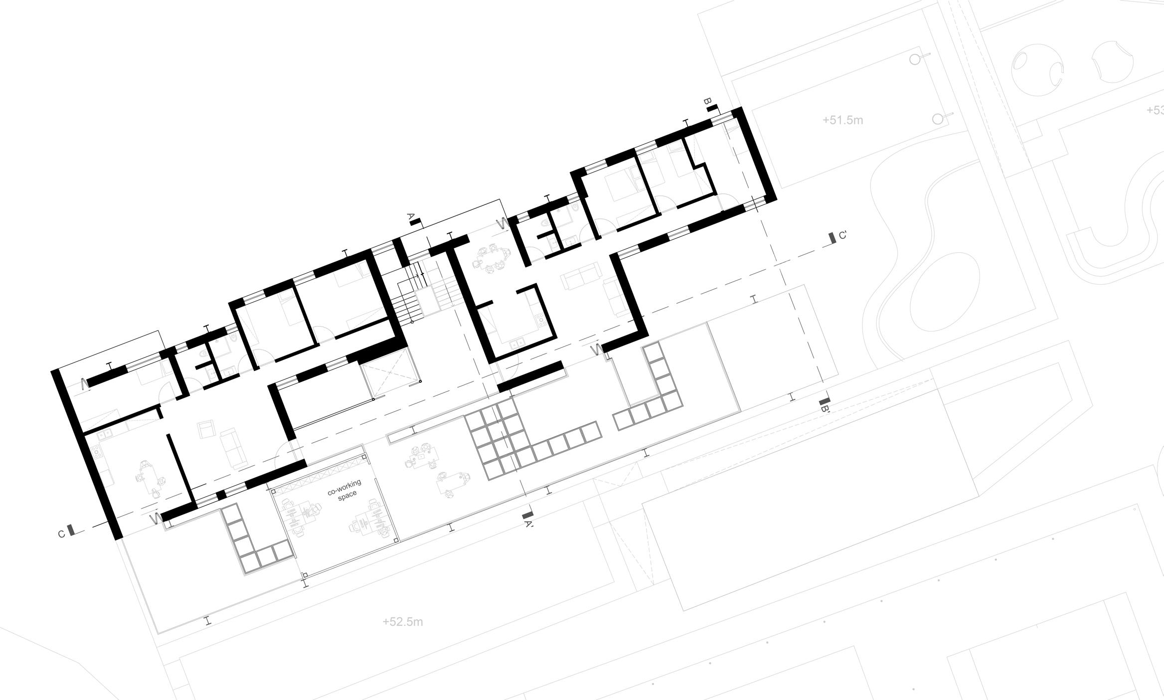 4 Two of the additional units will be the same in each typology; a communal kitchen on the ground floor, and a laundry room and common roof garden.