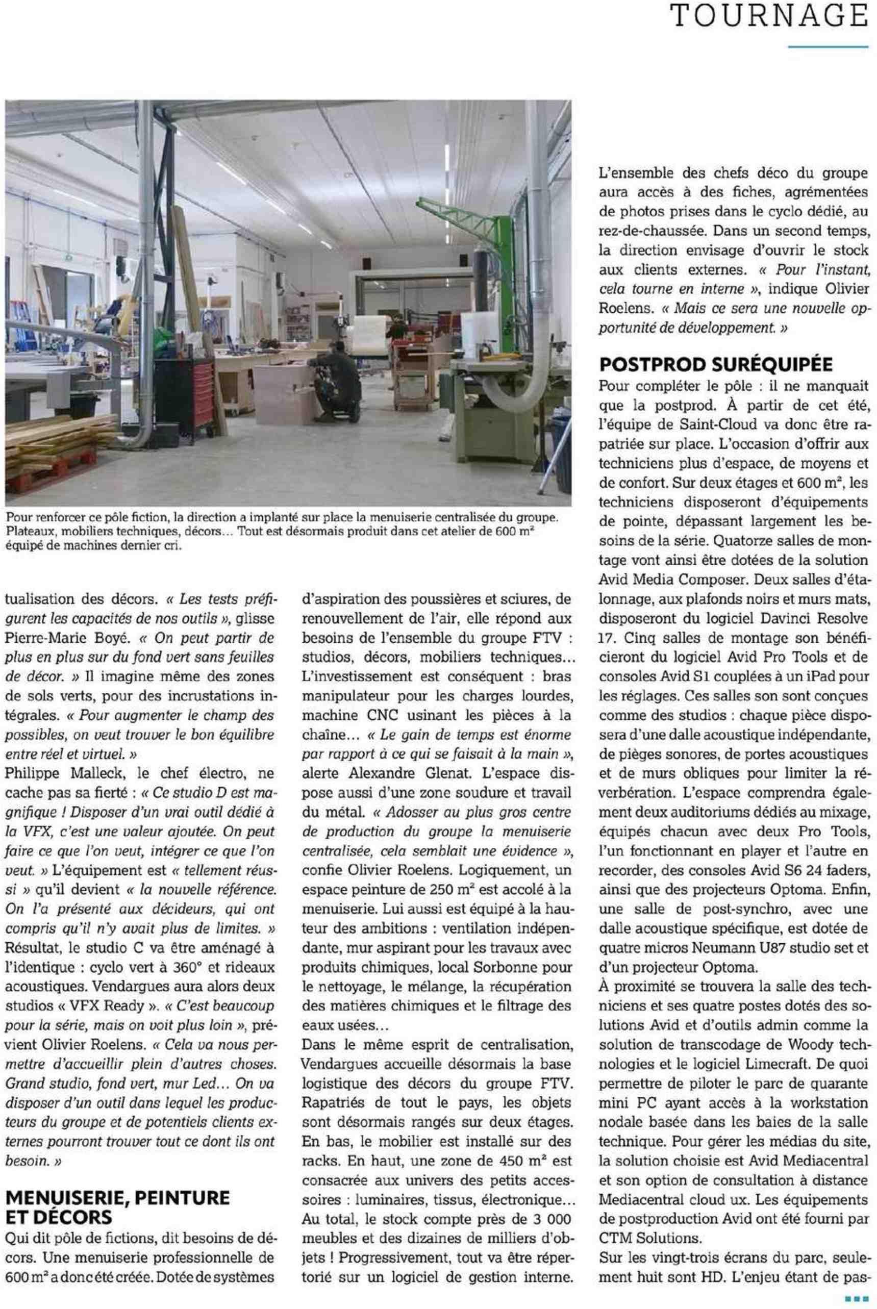 Pour compléter le pôle : il ne manquait que la postprod. À partir de cet été, l’équipe de Saint-Cloud va donc êtrerapatriée sur place.L’occasion d’offrir aux techniciens plus d’espace,de moyens et deconfort. Sur deuxétageset 600m2,les techniciens disposeront d’équipements de pointe, dépassant largement les besoins de la série.Quatorze sallesde montage vont ainsi être dotéesdela solution Avid Media Composer. Deux salles d’étalonnage, auxplafonds noirs et murs mats, disposeront du logiciel Davinci Resolve 17. Cinq salles de montage son bénéficieront du logiciel Avid Pro Tools et de consolesAvidS1couplées àuniPad pour les réglages.Cessalles sonsont conçues commedes studios : chaquepièce disposera d’unedalle acoustiqueindépendante, depiègessonores,deportes acoustiques et de murs obliques pour limiter la réverbération. L’espace comprendra également deuxauditoriums dédiésaumixage, équipés chacun avec deux Pro Tools, l’un fonctionnant en player et l’autre en recorder, desconsoles Avid S6 24 faders, ainsi quedes projecteursOptoma. Enfin, une salle de post-synchro, avec une dalle acoustiquespécifique, est dotée de quatremicrosNeumann U87studio set et d’un projecteurOptoma.