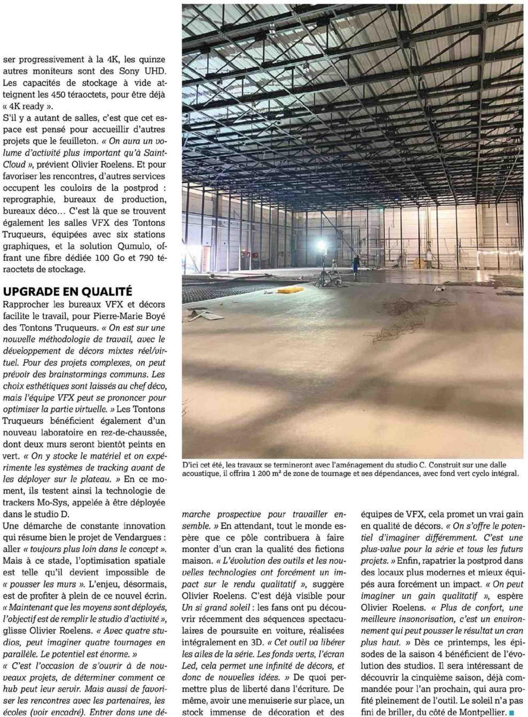 équipes deVFX, cela promet un vrai gain en qualité dedécors. « On s’offre le potentiel d’imaginer différemment. C’est une plus-value pour la série et tous les futurs projets.»Enfin, rapatrierlapostprod dans des locaux plus modernes et mieux équipés aura forcément un impact. « On peut imaginer un gain qualitatif », espère Olivier Roelens. « Plus de confort, une meilleure insonorisation, c’est un environnement qui peutpousserle résultat un cran plus haut. » Dès ce printemps, les épisodes de lasaison 4 bénéficient de l’évolution des studios. Il seraintéressant de découvrir la cinquième saison, déjà commandée pourl’an prochain, qui auraprofité pleinement del’outil. Le soleil n’a pas fini debriller, du côté deMontpellier.