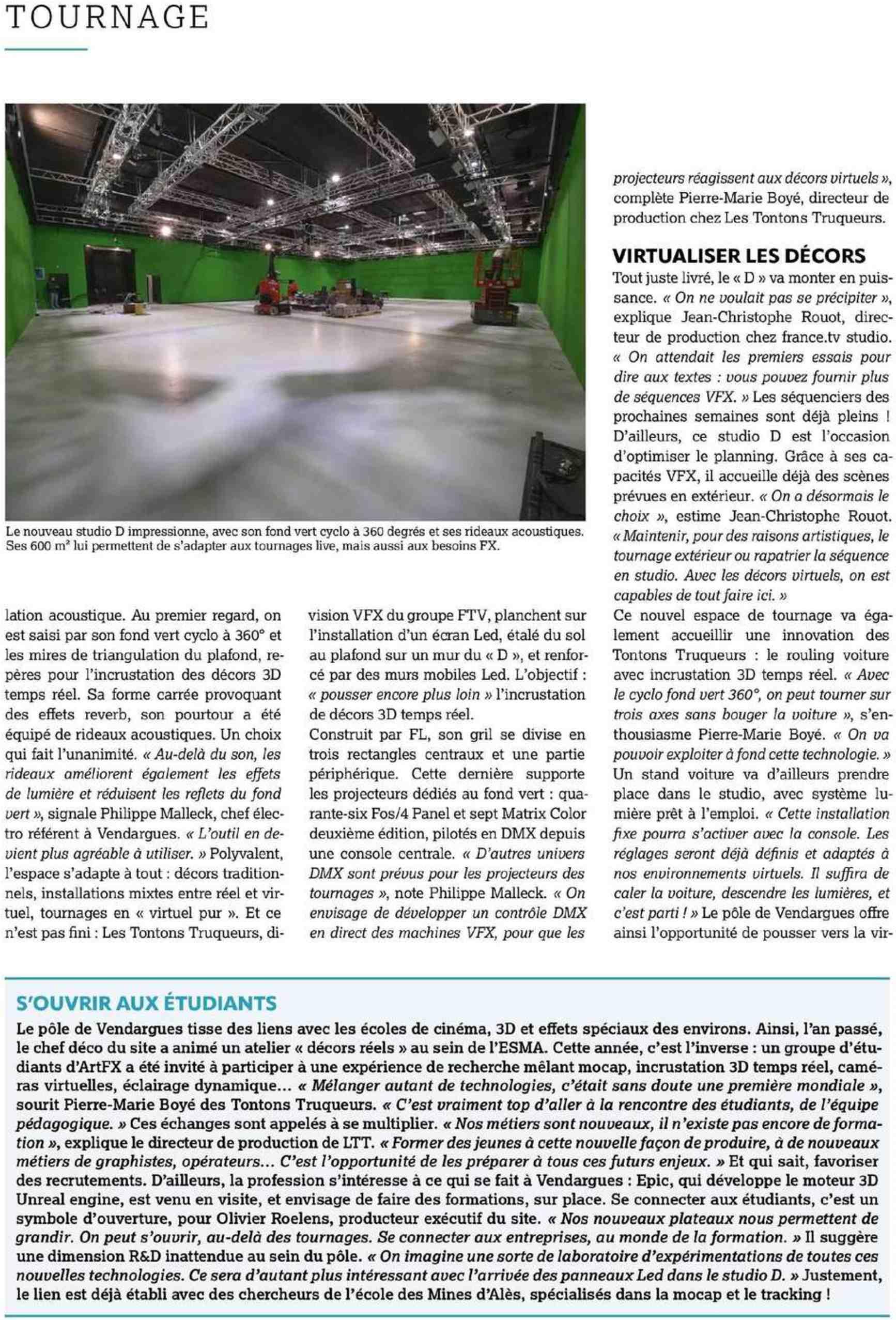 Philippe Malleck, le chef électro, ne cachepas safierté : « CestudioD estmagnifique ! Disposerd’un vrai outil dédiéà la VFX, c’est unevaleur ajoutée.On peut fairece quel’on veut,intégrer ce quel’on veut.» L’équipement est « tellementréussi » qu’il devient « la nouvelle référence. On l’a présenté aux décideurs, qui ont compris qu’il n’y avait plus delimites. » Résultat, le studio C va être aménagé à l’identique : cyclo vert à 360° et rideaux acoustiques. Vendarguesaura alors deux studios « VFX Ready». «C’estbeaucoup pourla série,maison voit plus loin »,prévient Olivier Roelens.« Celava nouspermettre d’accueillir plein d’autres choses. Grand studio,fondvert, mur Led…On va disposerd’un outil dans lequelles producteurs du groupeetde potentielsclients externes pourronttrouvertout cedont ils ont besoin.»