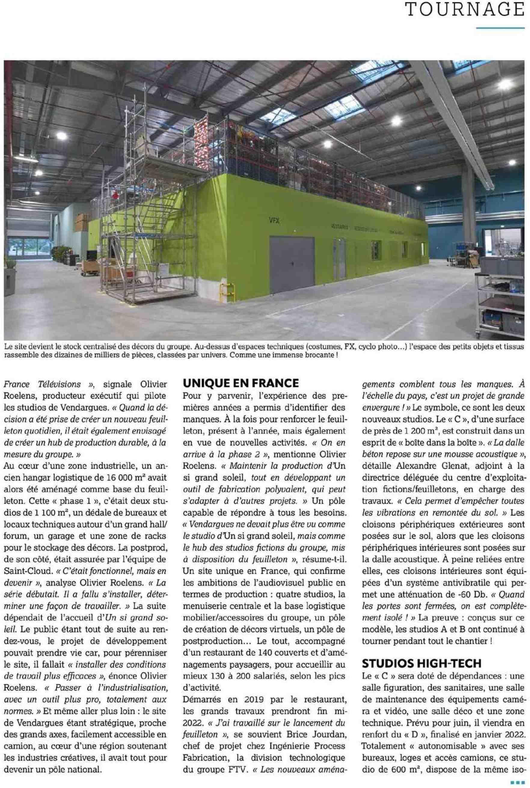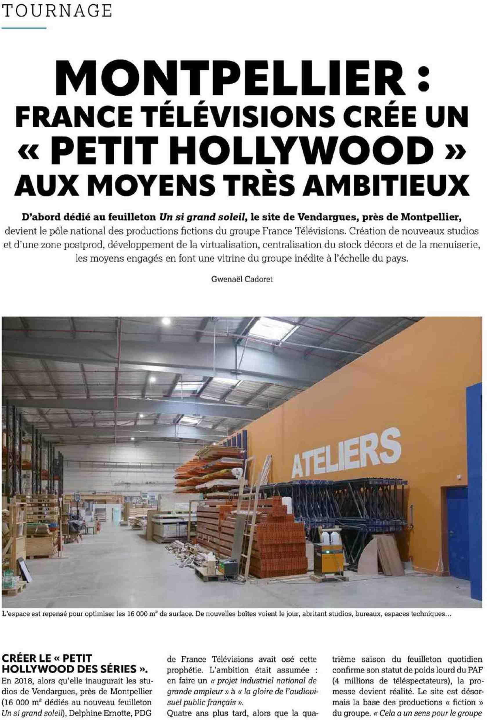 France Télévisions », signale Olivier Roelens, producteur exécutif qui pilote les studios de Vendargues.«Quand la décision aétéprise de créerun nouveaufeuilleton quotidien, il était égalementenvisagé de créerunhubdeproduction durable, àla mesuredu groupe.»