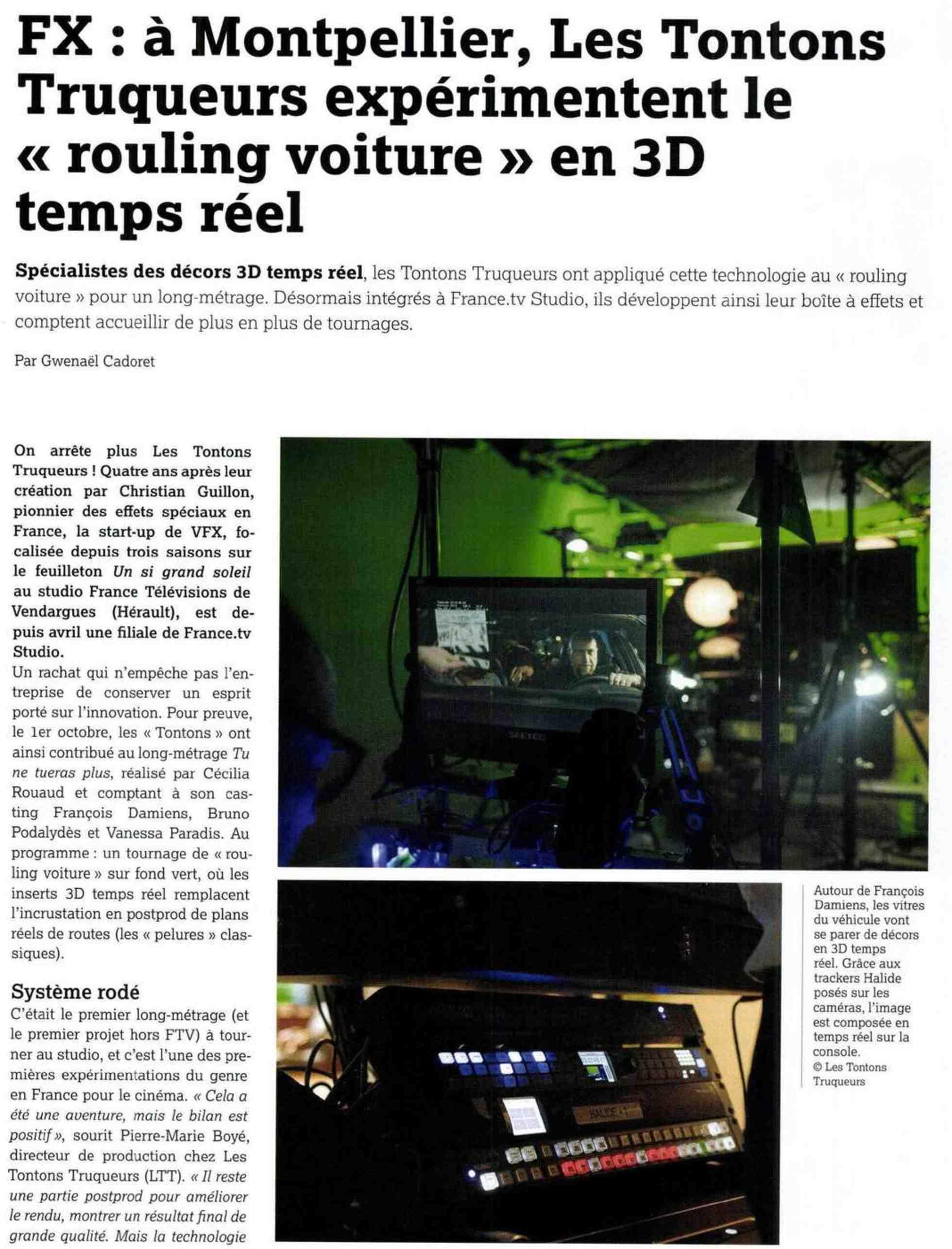 Un rachat qui n’empêchepas l’entreprise de conserver un esprit portésur l’innovation. Pourpreuve, le 1er octobre,les « Tontons» ont ainsicontribuéaulong-métrageTu ne tuerasplus, réalisépar Cécilia Rouaud et comptant à son casting François Damiens, Bruno Podalydèset VanessaParadis. Au programme: un tournage de « rouling voiture» sur fondvert, où les inserts 3D temps réel remplacent l’incrustation enpostproddeplans réelsde routes(les «pelures » classiques).