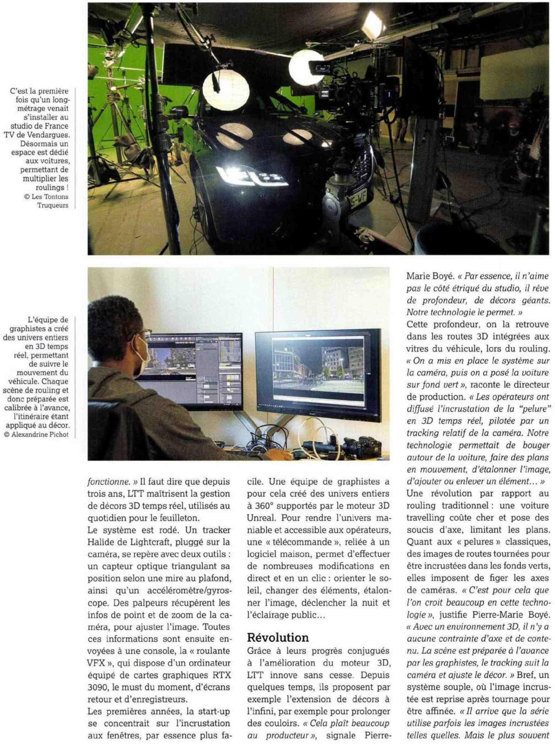 Spécialistesdesdécors 3D tempsréel, les Tontons Truqueursont appliquécettetechnologie au « rouling voiture » pour unlong-métrage. Désormais intégrés à France.tv Studio, ils développentainsileurboîteàeffets et comptent accueillir de plusen plus de tournages.