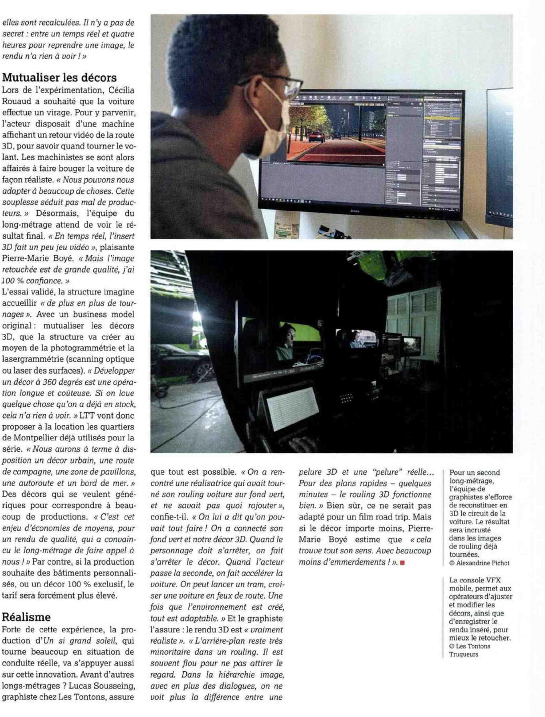 Forte de cette expérience, la production d’Un si grand soleil, qui tournebeaucoupen situation de conduite réelle, vas’appuyeraussi surcette innovation. Avantd’autres longs-métrages?LucasSousseing, graphistechezLes Tontons,assure