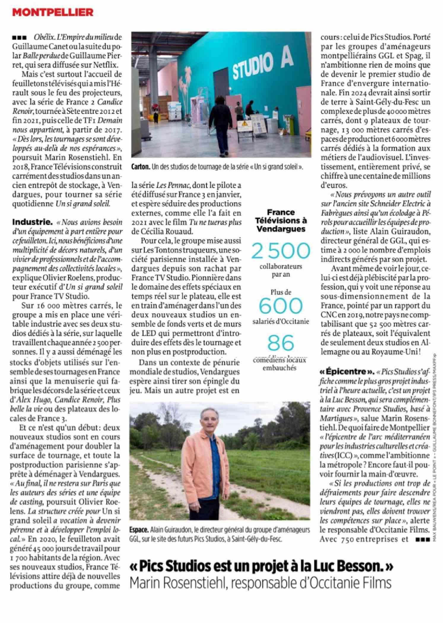 cours: celui dePicsStudios Porté par les groupes d aménageurs montpelliérains GGL et Spag, il n' ambitionne rien de moins que de devenir le premier studio de France d envergure internationale Fin 2024devrait ainsi sortir de terre à un complexede mètres carrés, dont 9 plateaux de tournage , r 000 mètres carrés d carrés dédiés à la formation aux métiers de l audiovisueL L investissement , entièrement privé se millions deuros.