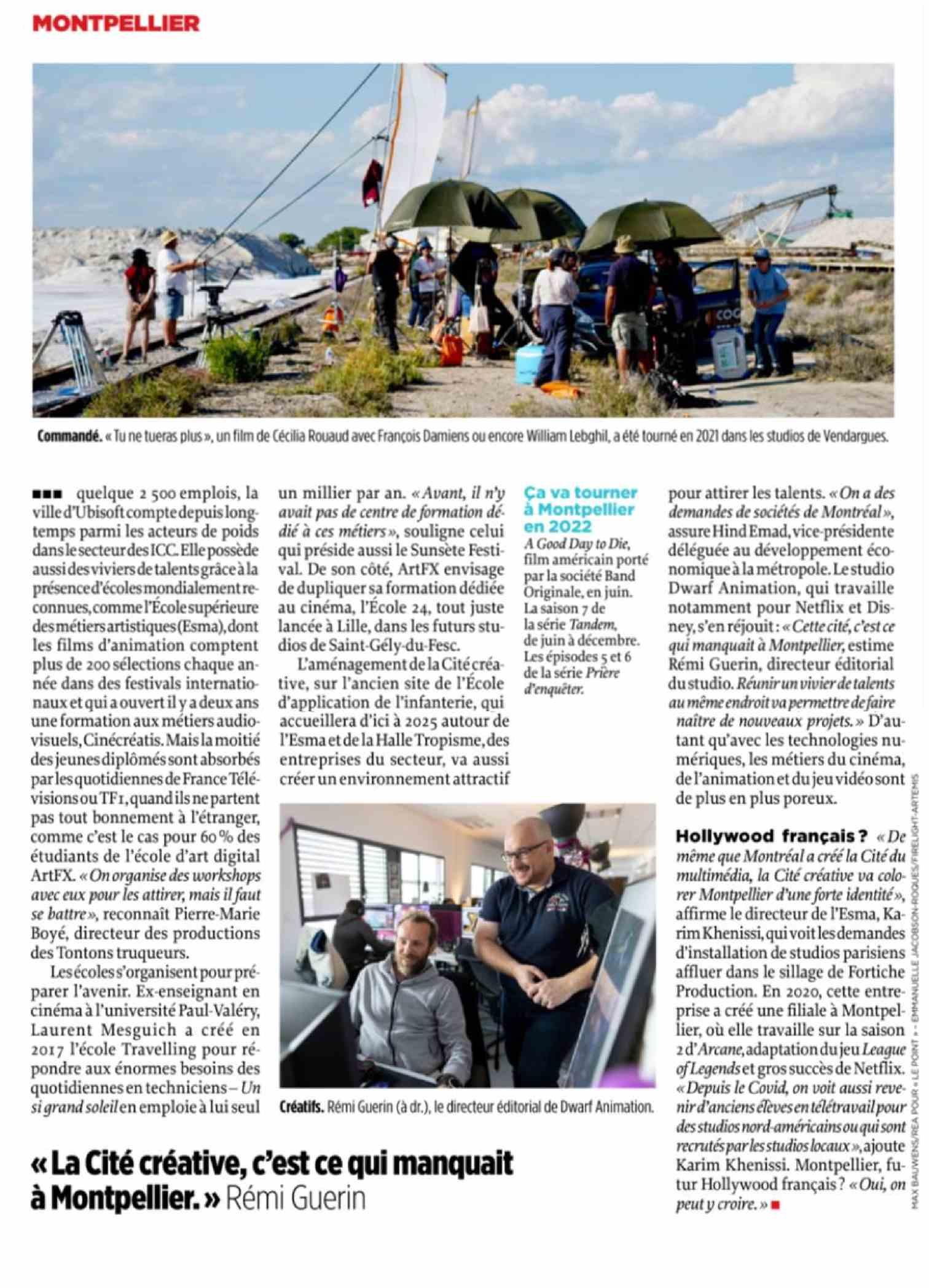 pour attirer les talents « ades demandesdesociétésdeMontréal» assureHind déléguée au développement économique la métropole Lestudio Dwarf Animation , qui travaille notamment pour Netflix et Disney s' en réjouit: qui manquait àMontpellier estime Rémi Guerin directeur éditorial du studio Réunirunvivier aumina endroit nitre denouveaux projets » D autant qu' avec les technologies numériques , les métiers du cinéma de jeu f de plus en plus poreux Hollywood français?