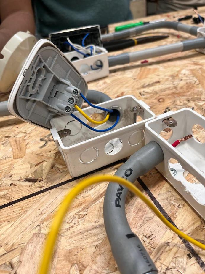 En las cajas octogonales y rectangulares se debe dejar 15cm del cable de la red para facilitar la realización de los empalmes Se realizan las conexiones de cables con los interruptores y los sockets, en ellos debe encontrarse el fase y/o neutro con su respectivo cable de retorno Para crear los empalmes hacia los puntos e interrupores se pela el cable y se une enrrollando, de manera envolvente, con otro cable para luego ser cubiertos por cinta, este proceso se conoce como derivación en T