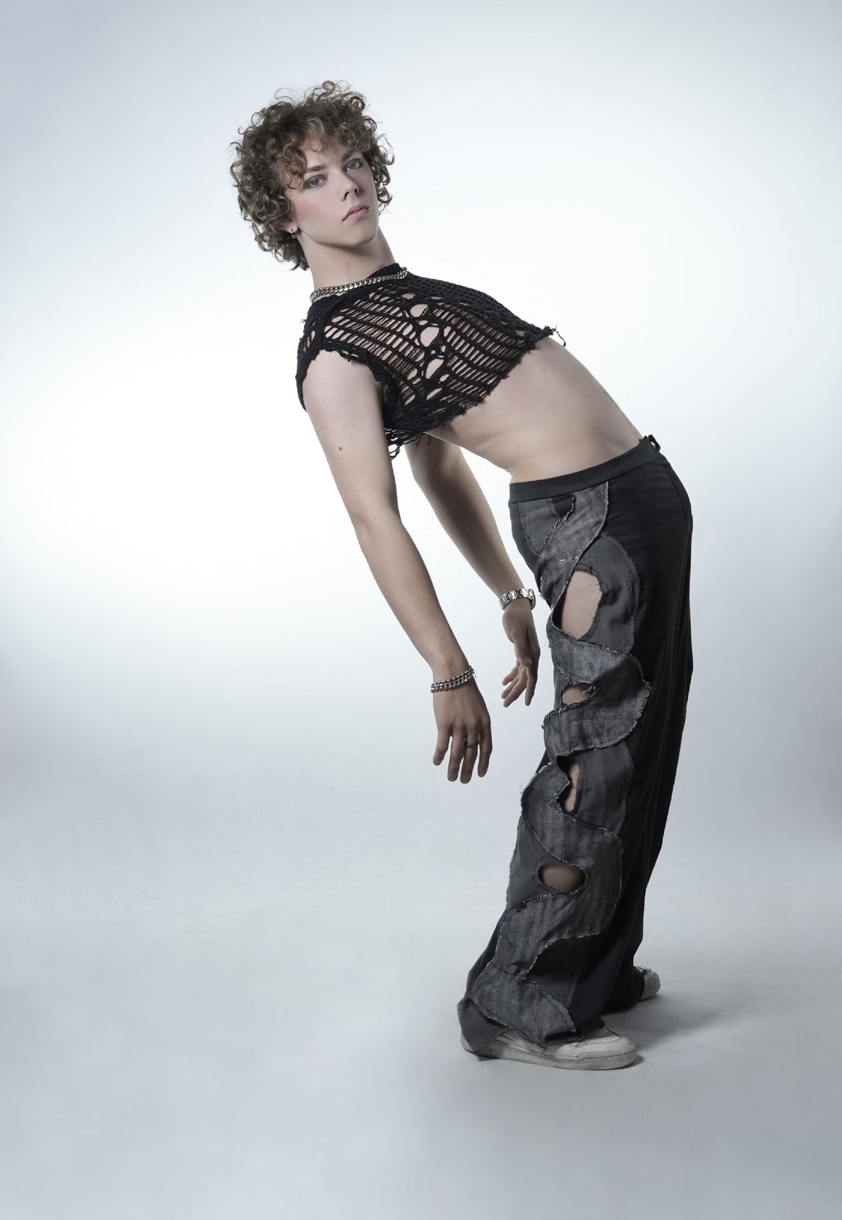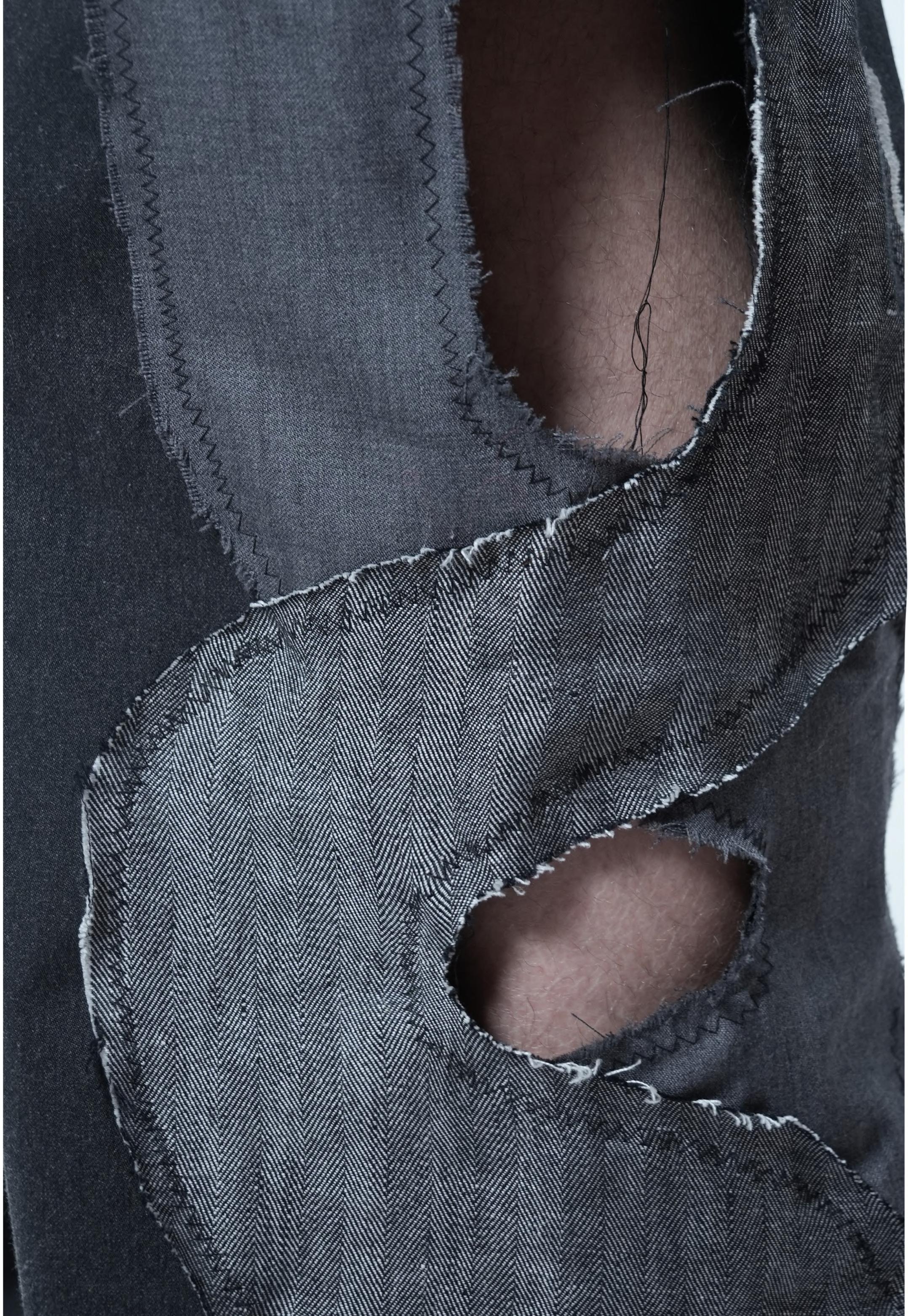 Ho interamente realizzato un outfit riutilizzando per il top, un vecchio maglione che ho riadattato secondo il concept della collezione, mentre poi ho creato un paio di jeans flare a vita bassa con dei dettagli catena con cut-out sui lati che dona un tocco di audacia al look, chiudendoli frontalmente con bottone e zip.