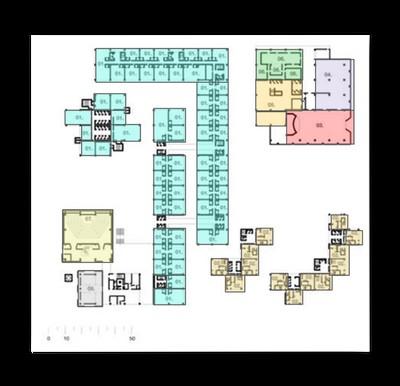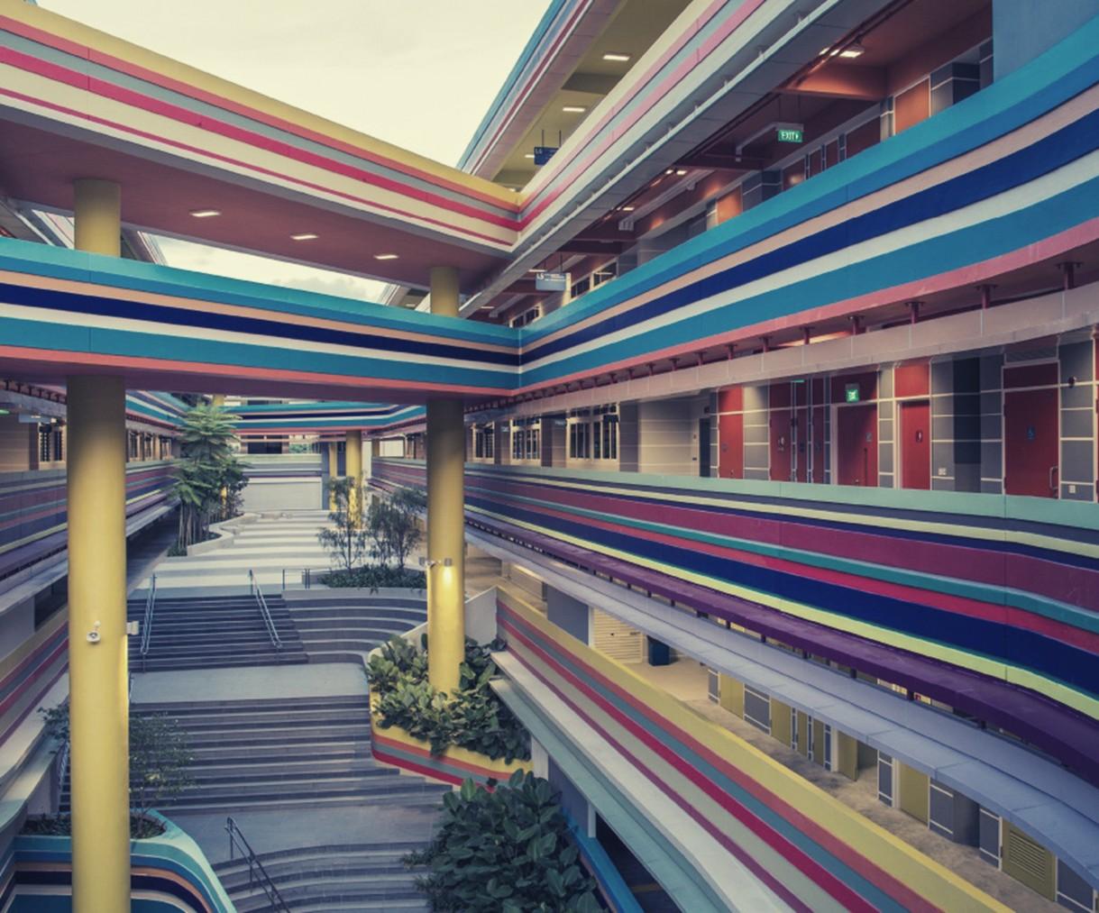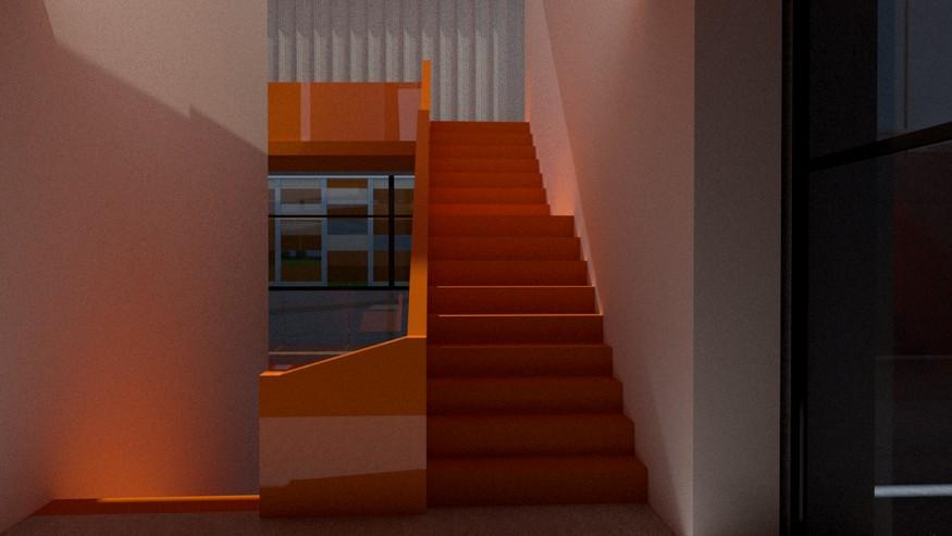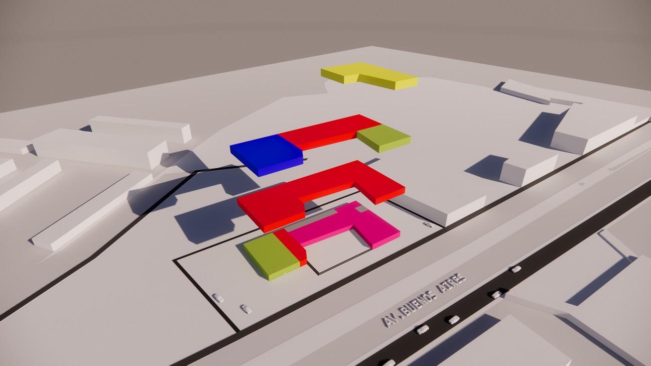 Los colores aplicados de la manera en que se logra ver la horizontalidad nos crea la sensación de una visual más lejana, además se ve la altura de pisos y los recorridos que también están ventilados e iluminados por la ubicación de los bloques