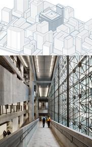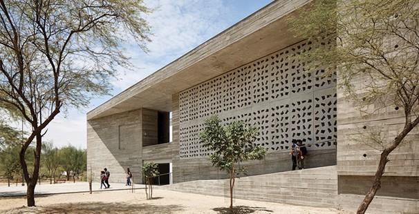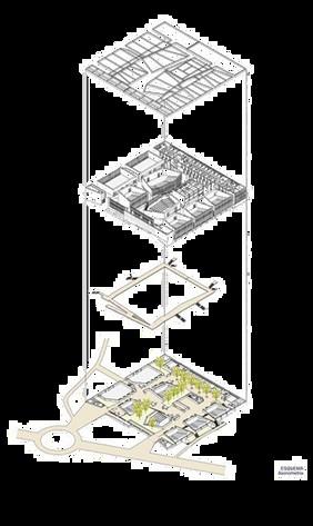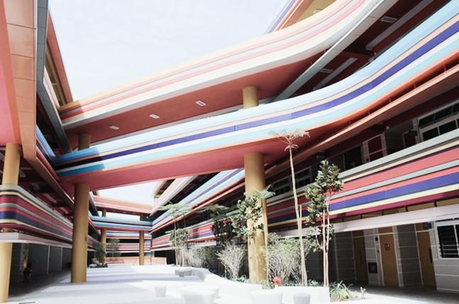 Del exterior, se tiene la impresión de un edificio compacto, geométricamente puro (70 x 70 m) pero al interior, se descubre un conjunto de 11 edificios independientes, de dos y tres niveles, bajo una cubierta generosa que produce sombra a los múltiples espacios de encuentro y circulación.