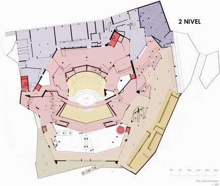 El concepto del edificio se basa en utilizar como elemento central a la orquesta y que todo rodee a ella. Crea elementos tipo terrazas donde alberga las butacas en diferentes niveles.