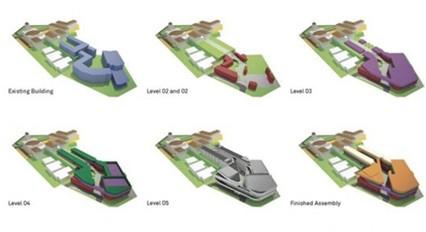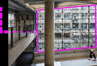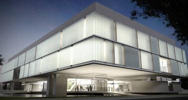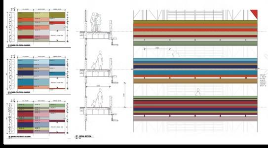 Este proyecto presenta en su fachada una piel de colores. La sucesión de fragmentos alineados permite el paso de luz.